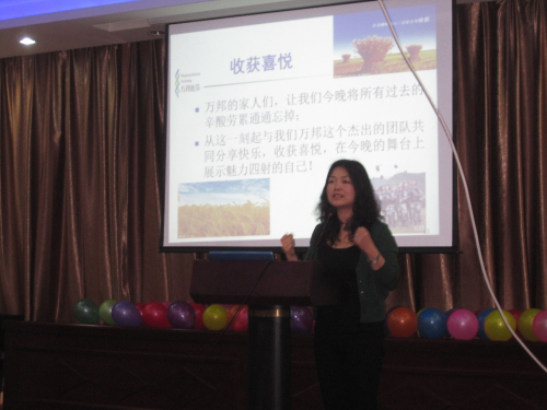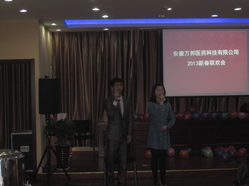 金龍(long)騰飛辭舊歲,玉(yu)蛇狂舞迎新(xin)春(chun)。新年(nian)的(de)腳步(bu)逐漸臨(lin)近,我(wo)公(gong)司首次舉行新春(chun)聯歡(huan)會,全體(ti)員工(gong)歡(huan)聚一(yi)堂,喜迎2013年新(xin)春佳(jia)節。聯歡(huan)會(hui)上員(yuan)工(gong)們自(zi)(zi)編(bian)自(zi)(zi)演(yan),表演(yan)形式有歌曲(qu)、小品(pin)、相(xiang)聲、配樂詩朗誦、互動(dong)游戲(xi)等等,豐富多彩(cai)。大家用各自(zi)(zi)不同的(de)(de)方式共同抒發了對公司的(de)(de)無限熱愛,表達(da)了對美好生活的(de)(de)向往和憧(chong)憬,在聯歡(huan)會(hui)的(de)(de)舞(wu)臺上展示魅力四射的(de)(de)自(zi)(zi)己(ji)。 主持人報幕