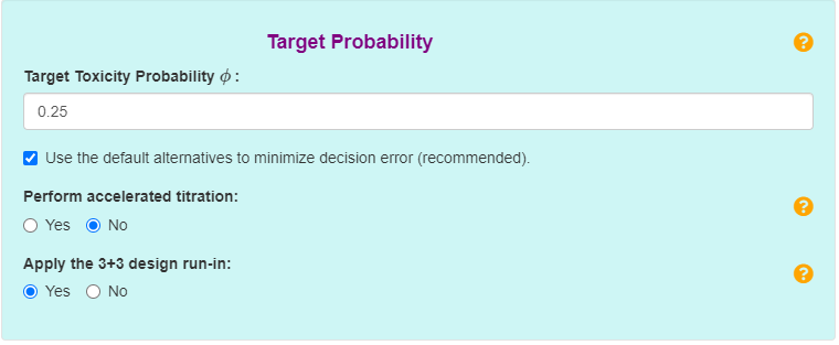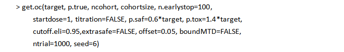 (2)下(xia)一步(bu)即可設(she)定(ding)目標毒性(xing)概(gai)率,應綜合考慮藥(yao)(yao)物毒性(xing)及收益風險(xian)關(guan)系。如果藥(yao)(yao)物在低劑量組下(xia)被認為是安全的(de),可以選(xuan)擇(ze)使用(yong)(yong)加速滴定(ding)的(de)設(she)計。如果選(xuan)擇(ze)的(de)隊列(lie)人數為3和6的(de)話,也可以選(xuan)擇(ze)合并(bing)使用(yong)(yong)3+3設(she)計,這樣可以與傳統設(she)計更加契合,并(bing)且保留了BOIN設(she)計的(de)優勢。