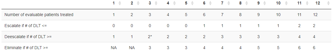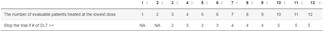 如果(guo)選擇了(le)更加嚴(yan)格的(de)(de)第一劑(ji)量組(zu)剔除規則(ze)的(de)(de)話(hua),還會(hui)得到一個試驗終止決策(ce)表: