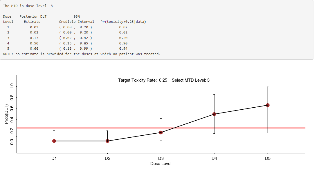 當試驗全部完成后,我(wo)們(men)可(ke)以(yi)通過Select MTD選項卡,輸入(ru)我(wo)們(men)試驗獲得(de)(de)的數(shu)據(ju),從而得(de)(de)到一個(ge)不同劑(ji)(ji)量(liang)水平(ping)下MTD的選擇概率(lv)。如下圖所示(shi),第(di)三劑(ji)(ji)量(liang)水平(ping)的DLT概率(lv)最為(wei)接近我(wo)們(men)的目(mu)標(biao)毒性概率(lv),故MTD為(wei)第(di)三劑(ji)(ji)量(liang)水平(ping)。