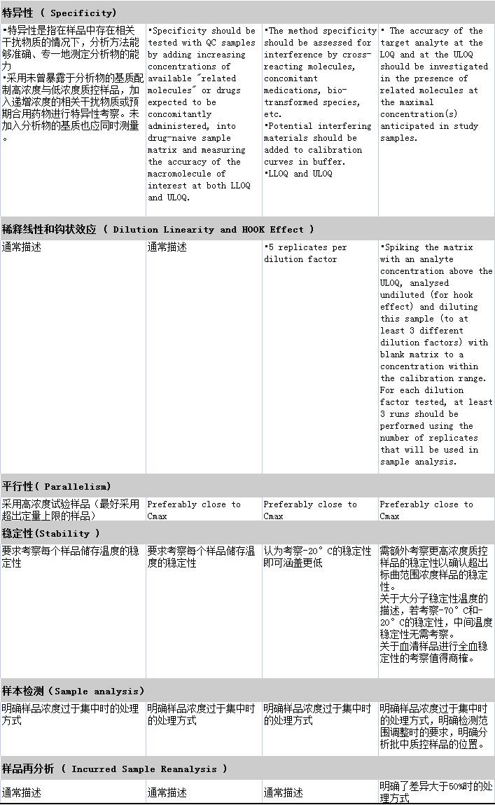 從整體結構來說FDA和ICH版本都在最后采用了表格形式進行總結,FDA的總結是針對所有驗證項和試驗環節的,清晰明了,ICH僅針對試驗環節。ICH整體邏輯很順,大小分子描述都很完整。ICH將方法學拆分為方法建立和方法驗證2個階段,FDA版本中也有強調方法建立和方法驗證的區別,EMA、NMPA版則未明確區分。詳見下表: