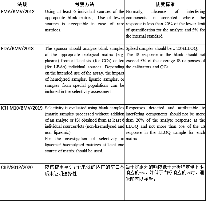 針對某些考察項,各法規間或可存在差異。例如,生物分析方法驗證中關于選擇性考察,主流指導原則考察方法和接受標準見下表: