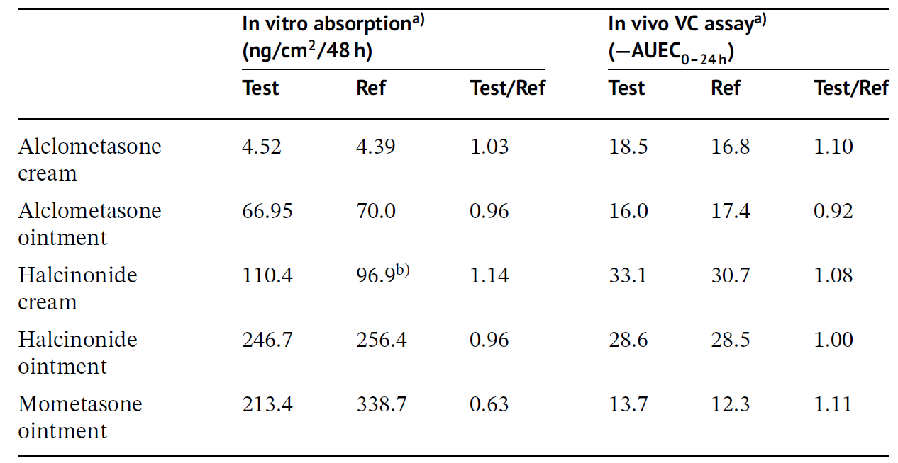 Franz等人在臨床前開發期間評估了7種開發的仿制藥產品(兩種維A酸凝膠和五種糖皮質激素制劑)中API的吸收情況,并在IVPT研究中與參比制劑進行了平行比較。隨后對受試制劑和參比制劑進行了臨床終點BE研究(維A酸凝膠)和人體血管收縮試驗(VC)研究(糖皮質激素制劑),所有預期的仿制產品均被確認與各自的參比制劑具有生物等效性,并隨后獲得FDA批準。