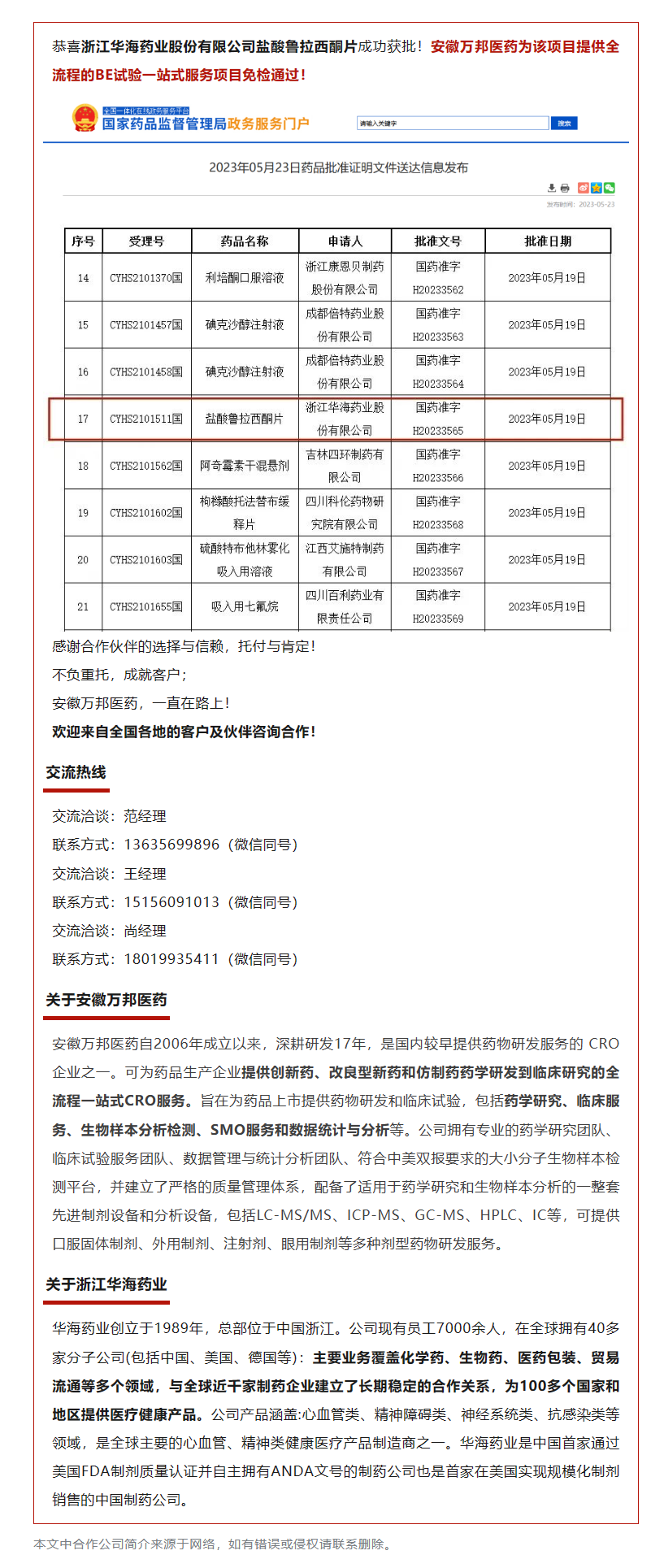 喜報|安徽萬邦醫藥助力浙江華海鹽酸魯拉西酮片成功獲批