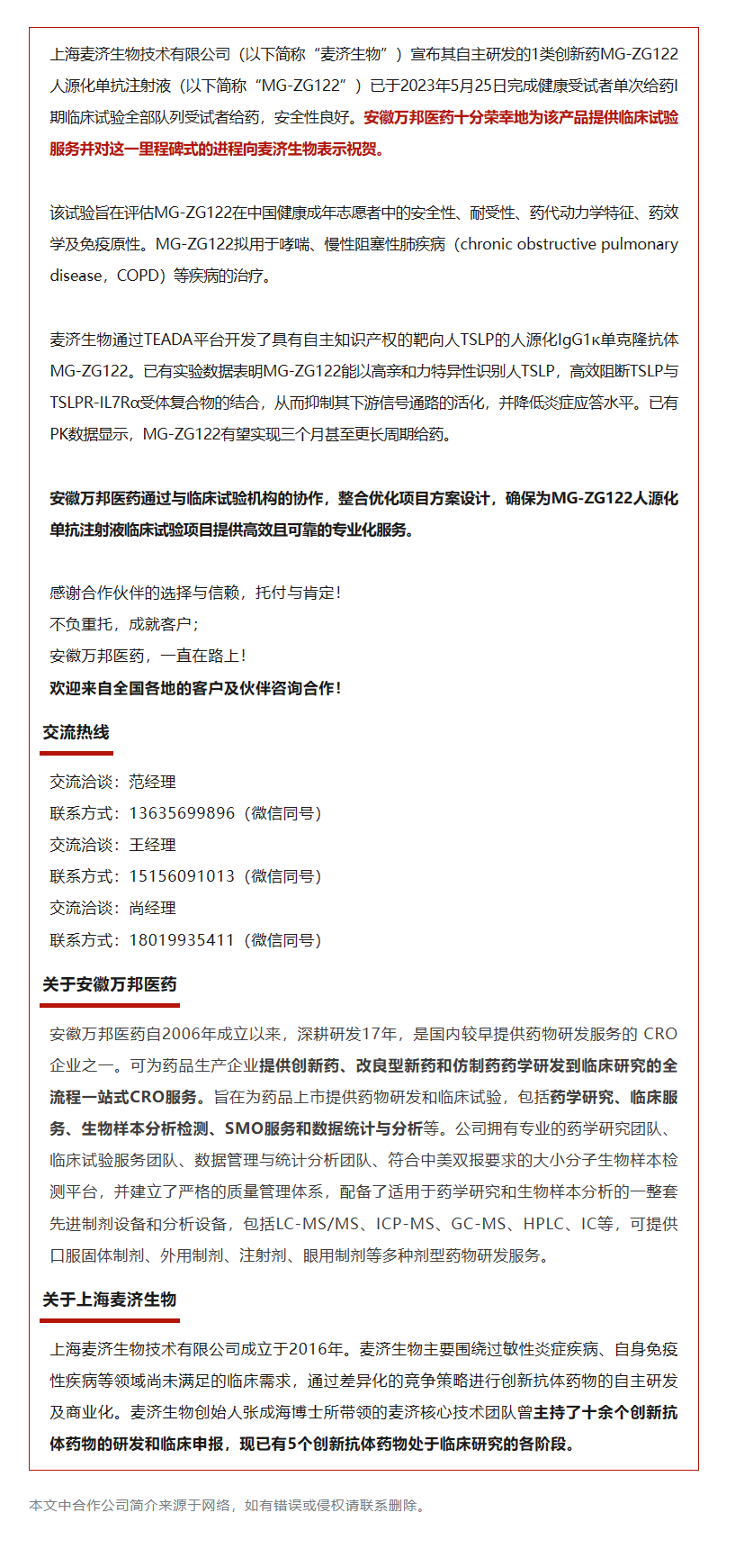 喜訊|安徽萬邦醫藥助力麥濟生物MG-ZG122人源化單抗注射液完成Ⅰ期臨床給藥