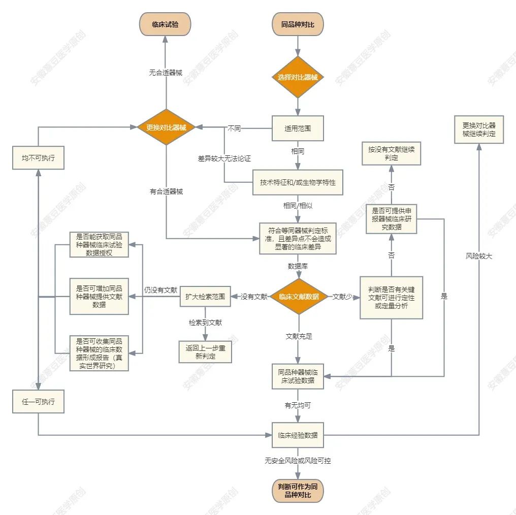 2. 申報產品是參照已上市產品設(she)計開發,那優(you)先采用參照器械作為同品種器械,后(hou)續步驟參照流(liu)程圖決(jue)策。這里建議(yi)申辦(ban)者在(zai)設計開發早期就做好這部分的調研工(gong)作,以確保后(hou)續注冊流(liu)程的順暢;